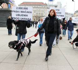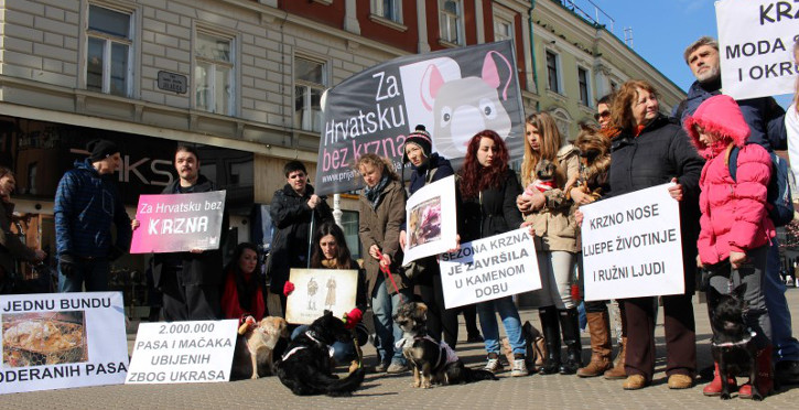 On February 21 we organized a public action at Zagreb central square which purpose was to educate the public about the problem of exploiting and killing of animals for fur. Even dogs symbolically wrapped in “bloody” bandages participated in the action which warned that a large number of furry fashion accessories are still made from the fur of dogs, cats and other animals. Even the president of Croatia Kolinda Grabar-Kitarovic supported the action with her presence.X