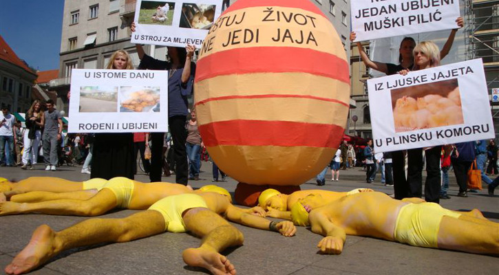 Povodom uskršnjih blagdana šokantnim performansom upozorili smo potrošače na masovno ubijanje muških pilića kao ‘neželjene robe’ u proizvodnji jaja. Na Trgu bana Josipa Jelačića u Zagrebu 9. travnja petero naših aktivista obojanih u žuto pod velikom pisanicom dočaralo je sudbinu muških pilića ubijenih u istom danu kad su rođeni. Kratak film o ubijanju pilića možete vidjeti na našem YouTube kanalu, a također pogledajte i foto galeriju pilića u valionicama te PP prezentaciju na tu temu.