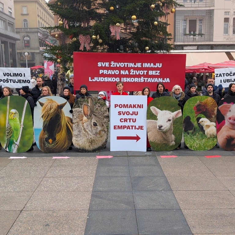 Povodom Međunarodnog dana prava životinja održali smo performans kojim smo skrenuli pozornost na nepravedno nejednak odnos ljudi prema različitim vrstama životinja – psima, svinjama, mačkama, kravama. Velikim fotografijama životinja – od onih koje većina smatra članovima obitelji do onih koje se iskorištavaju za hranu je uz poruku „Pomakni svoju crtu empatije” simbolično prenosilo činjenicu da sve životinje imaju pravo na život bez ljudskog iskorištavanja. Fotogaleriju pogledajte ovdje.