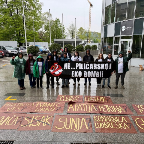 prosvjedni performans ispred Ministarstva zaštite okoliša i zelene tranzicije te iznijeli zahtjeve za odbacivanje planova 2 investitora za 24 projekta megafarmi, klaonica i pratećih pogona na području 4 županije.